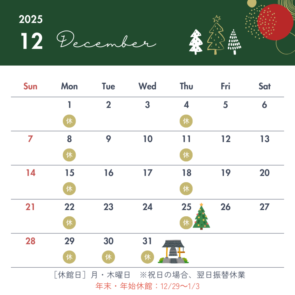 ※年末年始の休館は12月29日(月)~翌年1月3日(土)です。