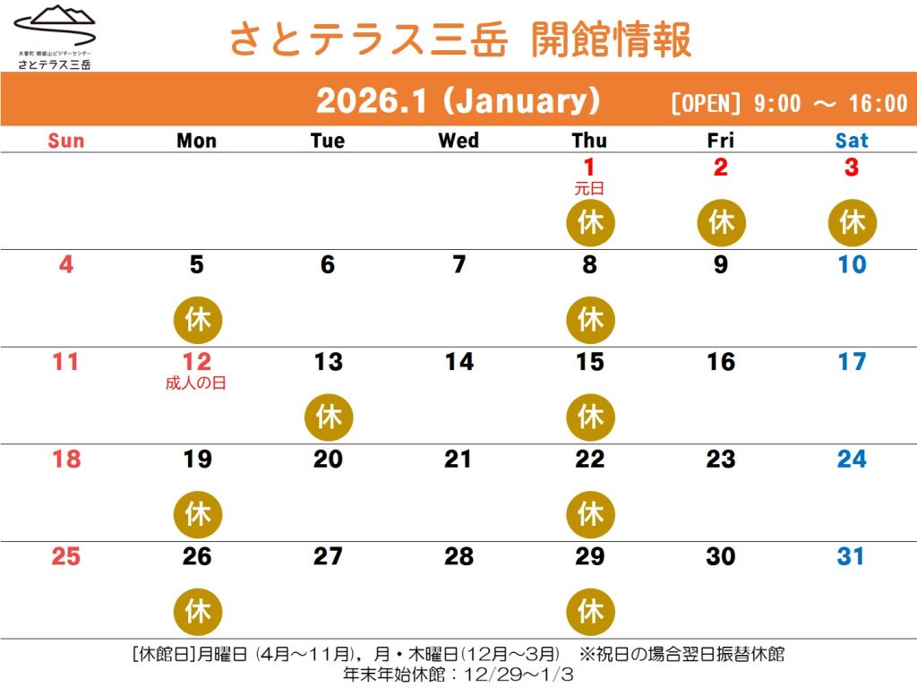 HOME » さとテラス三岳トップ » さとテラス最新情報一覧 » お知らせ » 開館情報(令和8年1月)