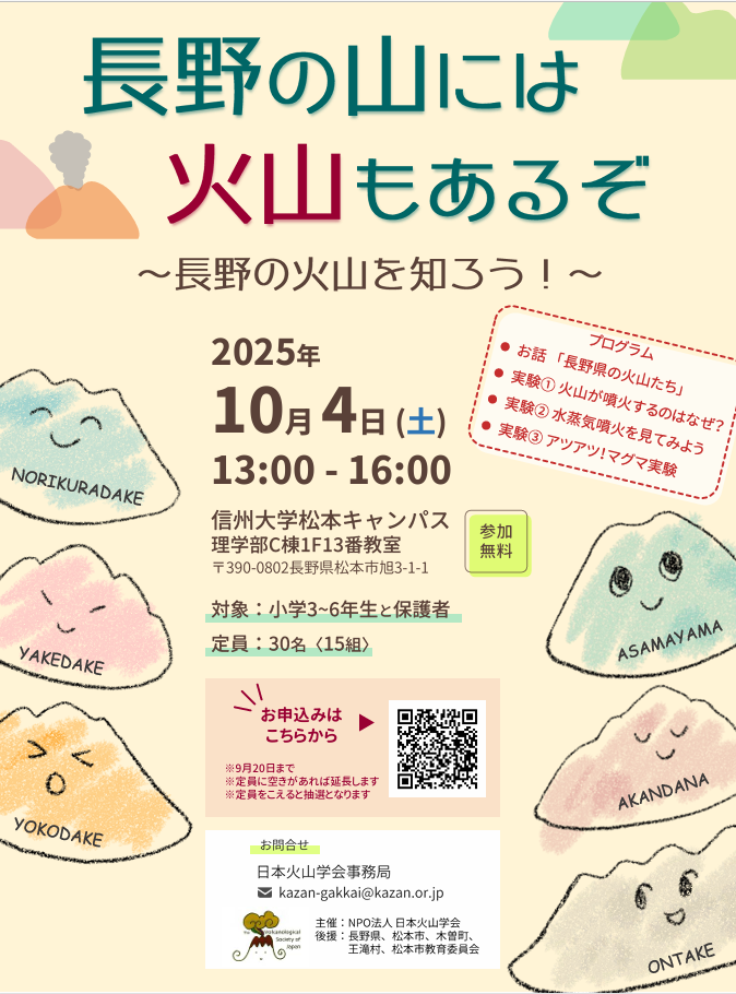 日本火山学会2025年 秋季大会が 松本市で開催されます。学術講演会の他 関連行事として10月4日(土)に 親子で火山実験 が開催されます!