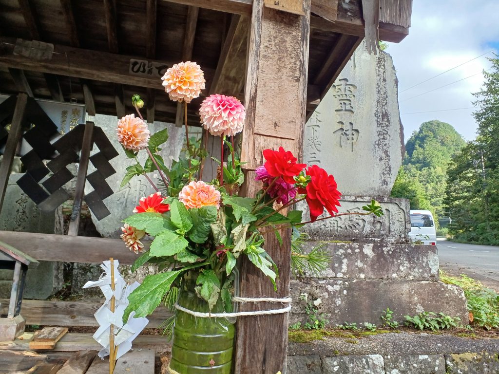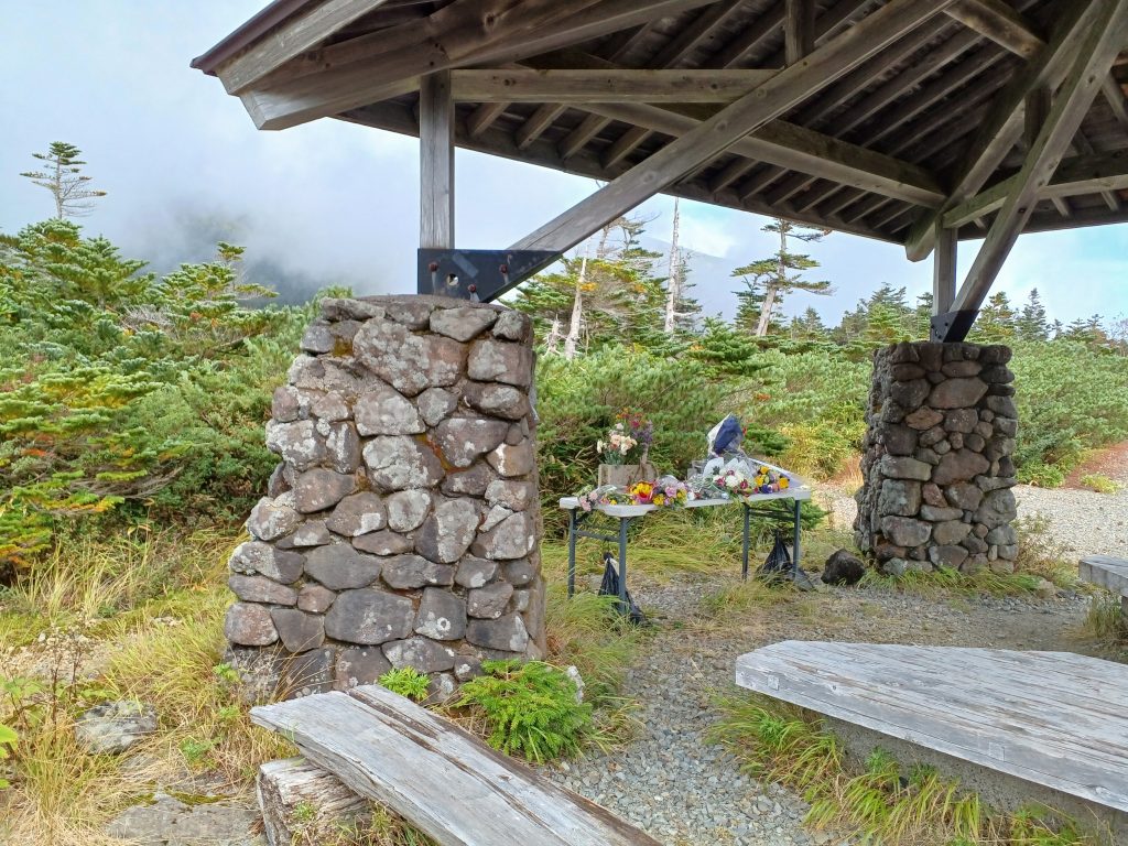 噴火災害から11年目の9月27日が過ぎて、 東屋には沢山の花束が添えられていました。深い想いが 御嶽山に届けられます。
