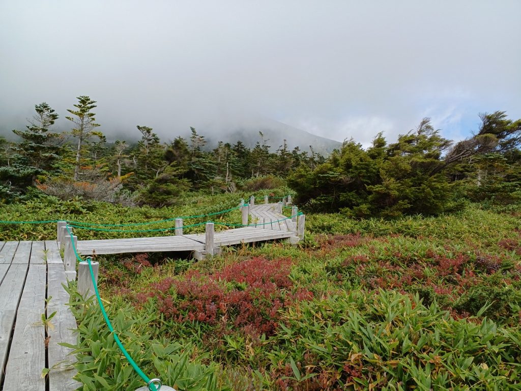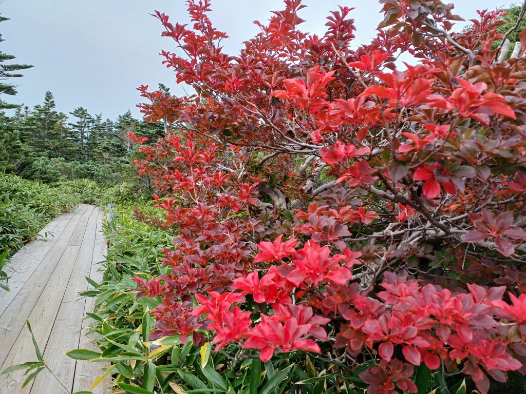 木道沿いのクロマメノキの葉が少しづつあざやかに変わり始めています。今朝の御嶽山は霧の中ですが、8合目から上は晴れているということでした。サラサドウダンの赤も見事です。展望台からは裾野のダケカンバやナナカマドが 赤に黄色に変わっている様子がわかります。
