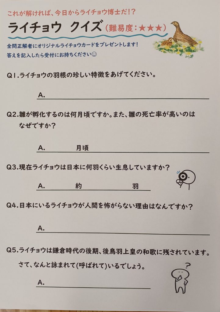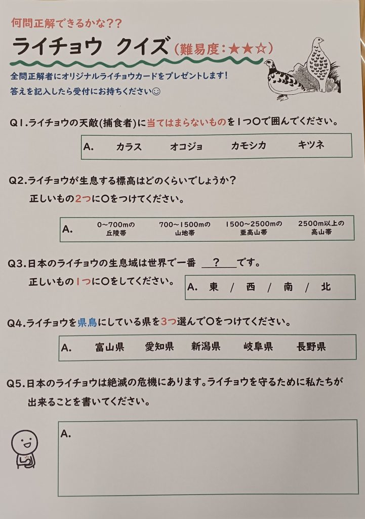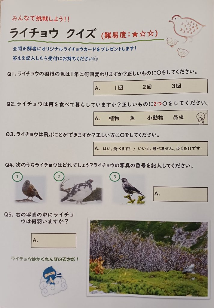 館内に入るとライチョウ クイズが並んでいます。昨日 小学生の女の子が ご家族と一緒に 難易度★~★★★まで3枚あるクイズに挑戦してくれました。お父さんが答えたところもあったそうですが、なんとすべて正解! ライチョウ博士の誕生です (^^)/