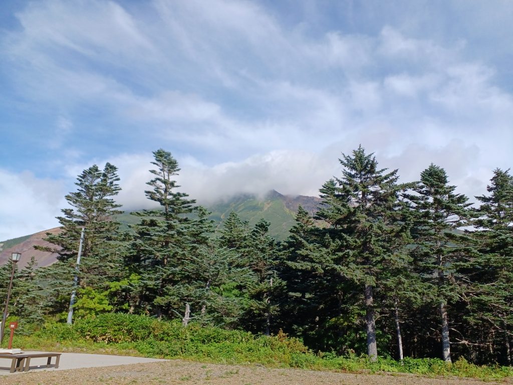 朝8時20分、王滝頂上の気温は13度。御嶽山の上部は雲に隠れたり現れたり… 昨日の頂上付近は風が強く寒かったと下山された方にお聞きしました。